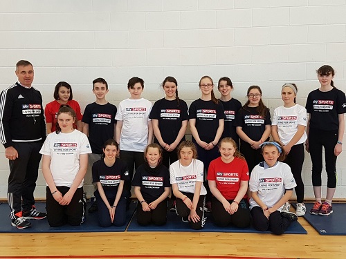 The Second Year Sky Sports Group enjoyed a visit from their mentor Owen Diviney on Thursday 17th November. Owen taught the students about the importance of teamwork, building confidence, being positive and never giving up. They participated in a wide variety of games and activities. Each student received a tshirt and wristband as a momento. The students who took part are pictured above with their mentor Owen.
