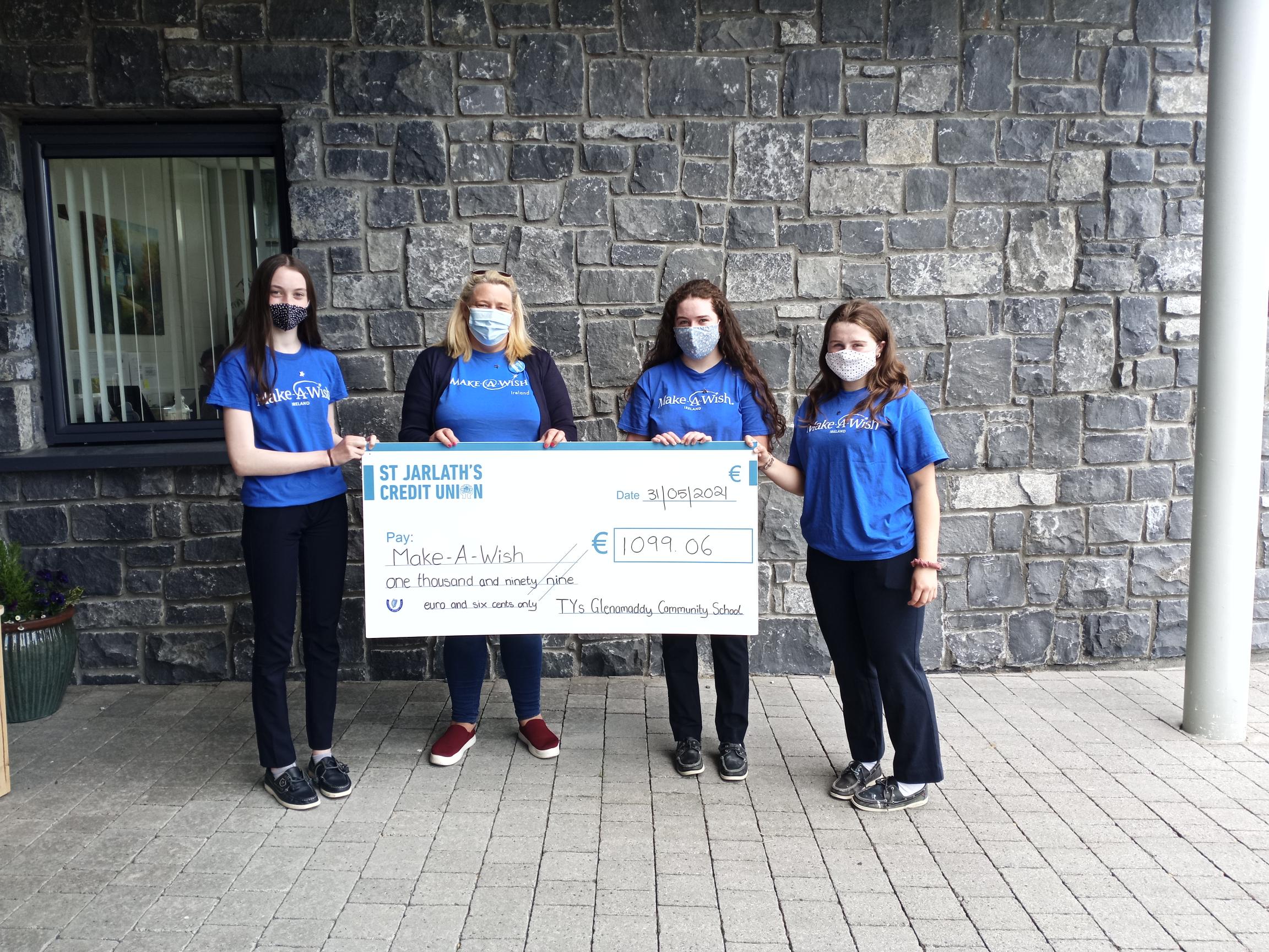 On the 31st of May, transition year students presented a cheque to Marcella Gemmell, our local volunteer with Make-A-Wish, with a total of €1099.06 for the charity. This money was raised by transition years who collectively completed 1500km and sold ice creams vouchers. Thanks to all who donated and supported our fundraiser and a special thanks to Londis and Mr. Duignan who helped with the ice cream vouchers.