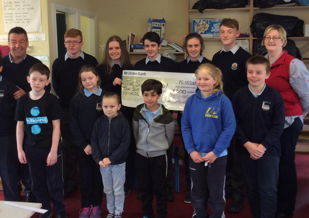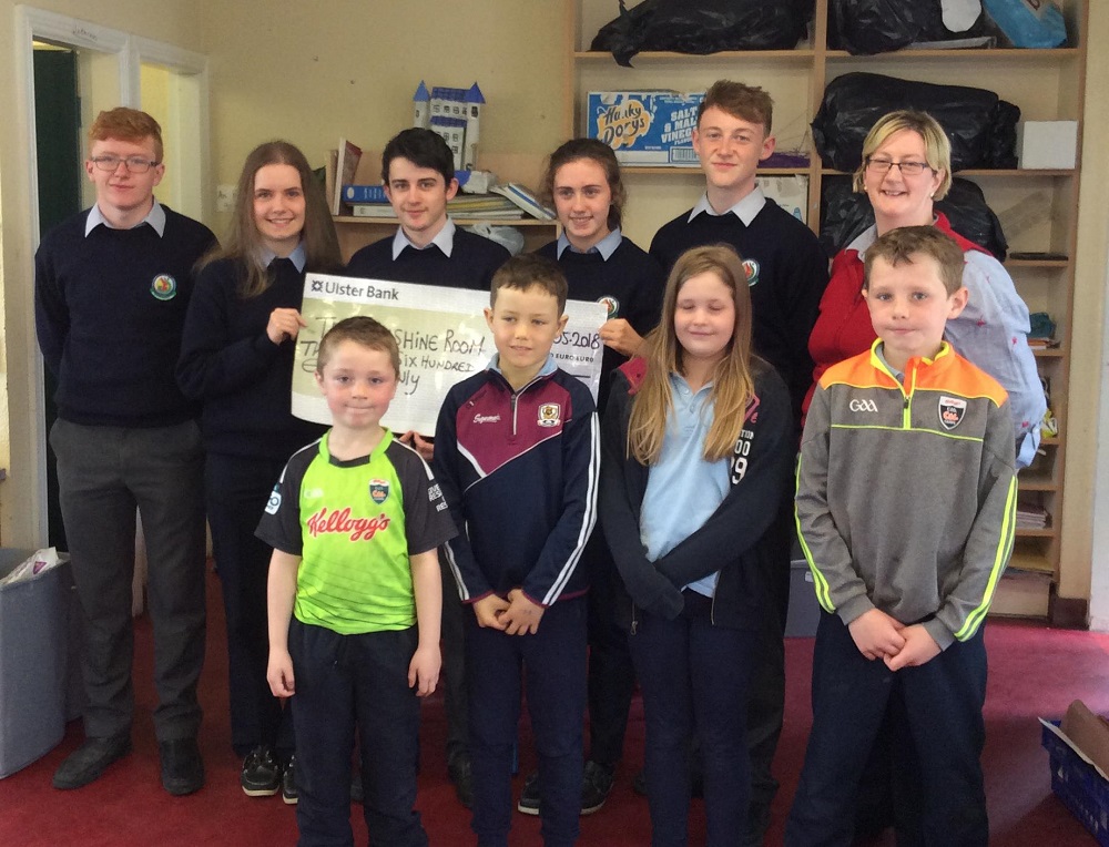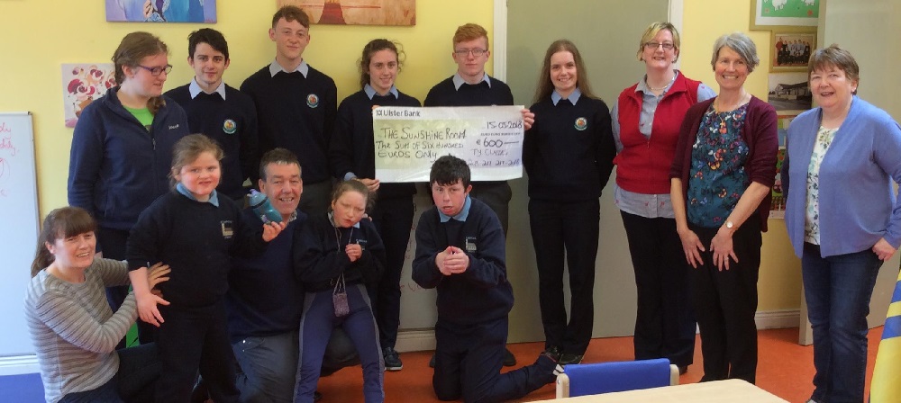 Transition Year Classes 2016-2018 from Glenamaddy C.S. recently made a donation to The Sunshine Class in Creggs N.S. They completed various fundraising activities throughout the two years. In the photos are Cathal Moran, Kate McGann, John Croghan, Eimear Collins, John Duignan along with their Enterprise teacher Margaret Griffin making the presentation to the students, Principal Gerard Dowd and staff of Creggs N.S. (Click on images to view)
